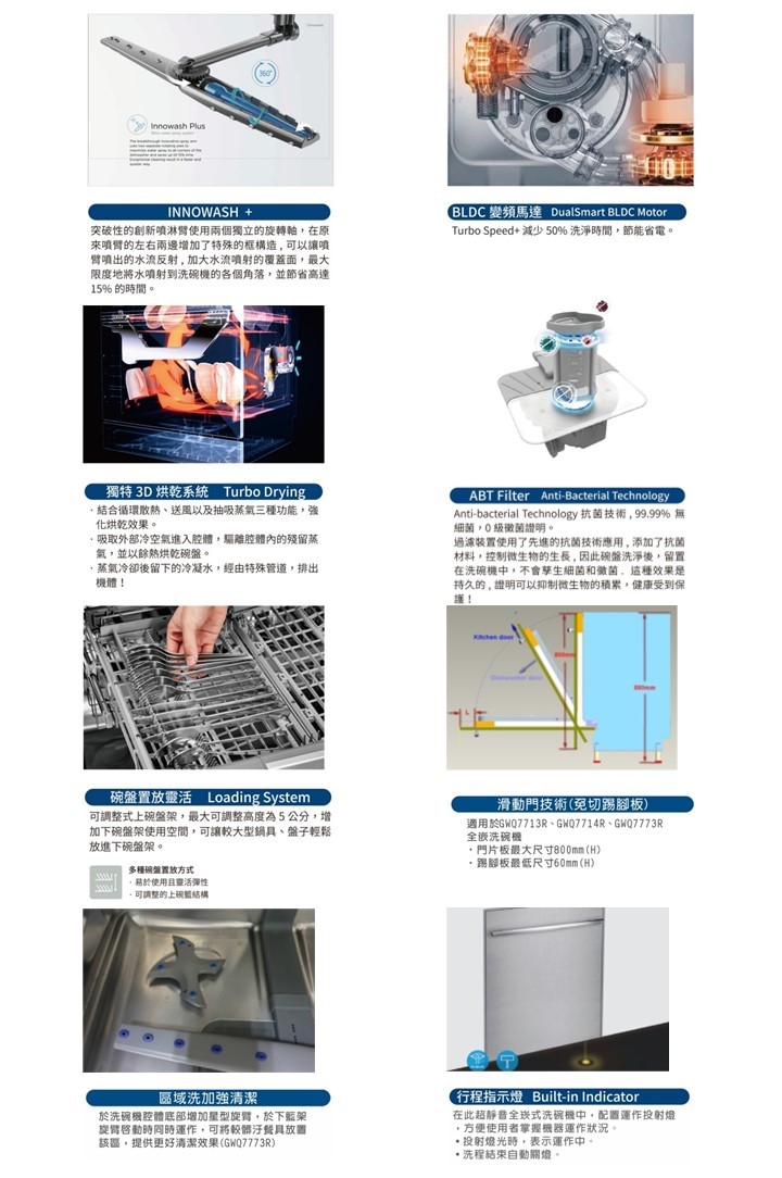 360度旋轉的 Innowash 噴臂, 多角度的水柱噴灑, 節省15%清洗時間
