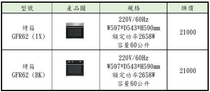 GFM62烤箱產品資訊如下 :