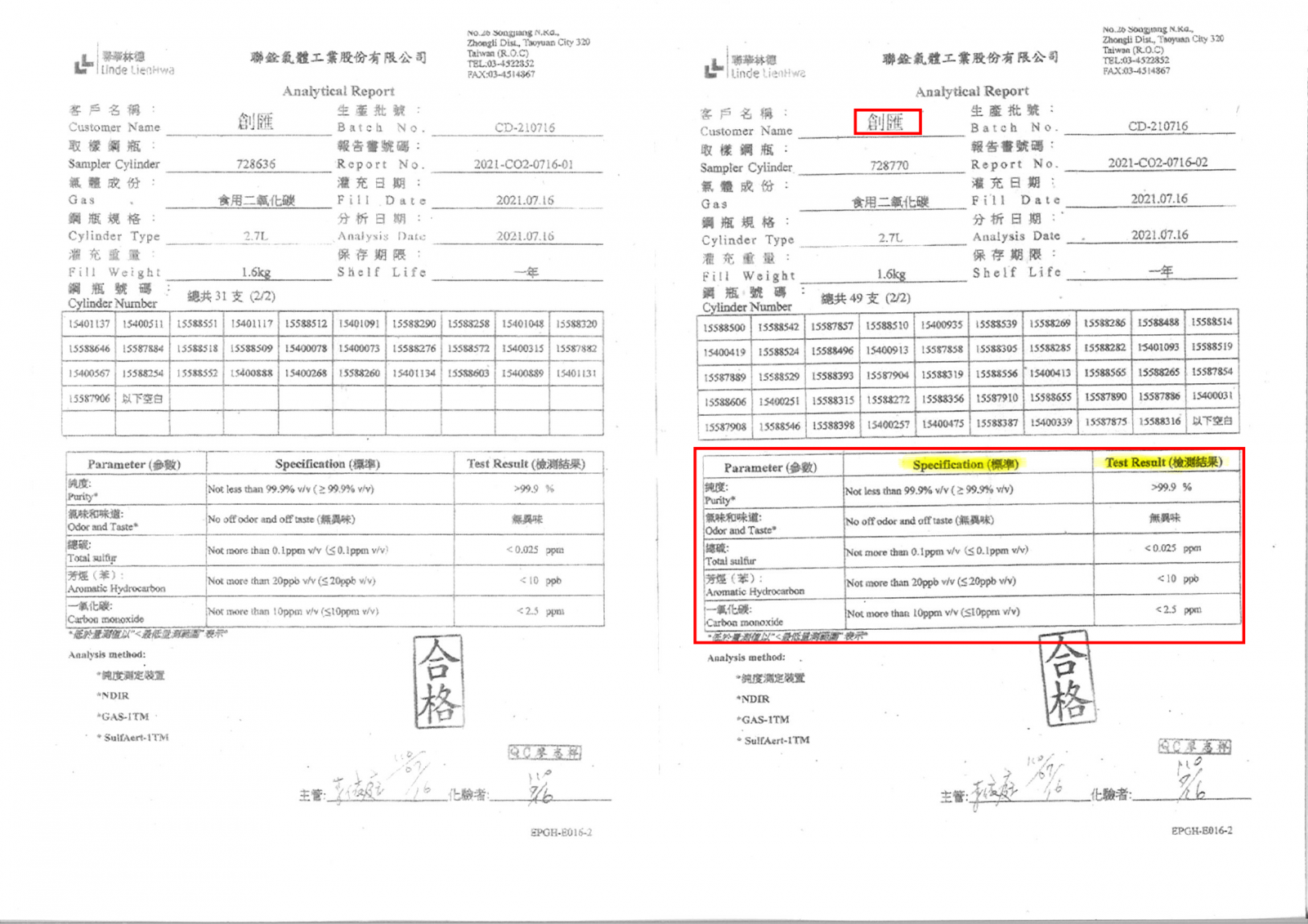 本公司氣泡水鋼瓶皆使用國家標準食用級CO2填充
